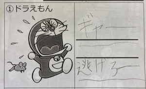 1問目はドラえもんがネズミから逃げている様子のイラストです。
