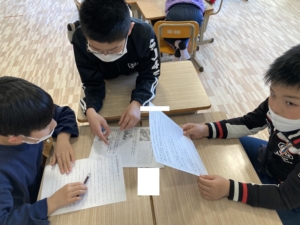 ①もしも桃太郎→もしも桃太郎が泣き虫だったら?という設定で物語を考えました。「桃太郎はすごく泣いてしまって、鬼を倒すことができなくて帰るのはどう?」「鬼が村に行ったら面白いんじゃない?」など、活発に話し合っていました。面白い物語になりそうです🍑