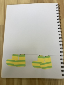 また、「だれのくつした?」というスケッチブック絵本を見るチームでは、カラフルな靴下と特徴的な足をよく見て、隠されている動物は何か当てていました。中には靴下や足だけでは想像するのが難しいものもありましたが、間違いを恐れずに手をあげて答え、頑張っていました!✋