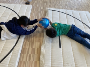ボールは一人では転がれないのでペアのお友達に押してもらいスタートします。