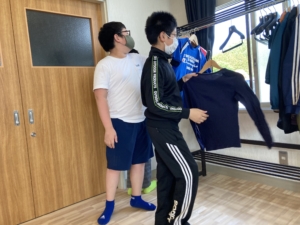 濡れた服のしわを伸ばしてハンガーにかける作業をしました!