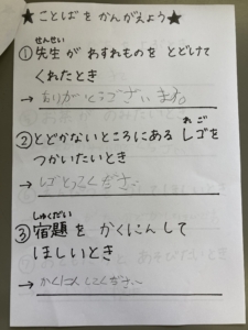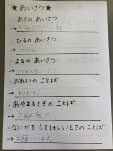 今回の適切な言葉遣いは「あいさつ」「正しい言葉を考えよう」という活動をしました。