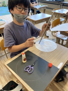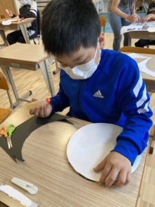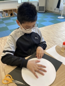 あらかじめ下書きされている丸い線をハサミで切り、段ボールに貼る作業をしています!