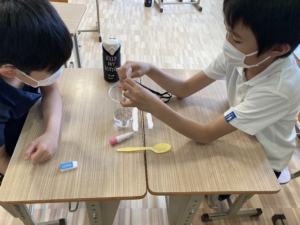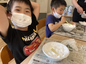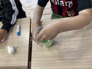 完成したものは手にまったくべたつかないふわふわのスライムで子どもたちは長い時間ずっと感触を