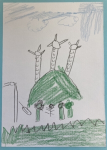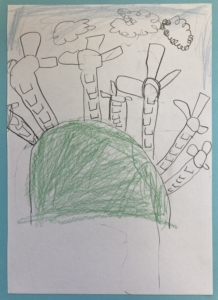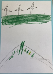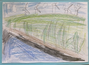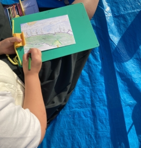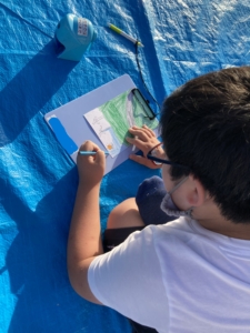 山の色を一色ではなく何色も重ねて塗っていたり、近いものは大きく描き遠いものは小さく描いたりと、さまざま工夫が見えました!✎