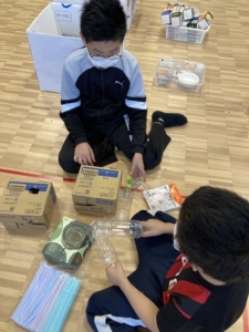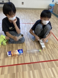 今回の活動は廃材(ペットボトルや牛乳パック)の中から自分の好きなものを楽器にして