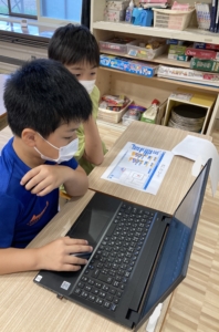 パソコンを覗き込んでいる姿はとても真剣!✨わからないところは職員に聞いたり、お友達と話し合いながら進めています。