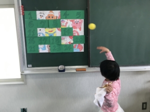 紙に書かれている番号を狙ってボールを投げ、当たった番号がめくられていきます!
