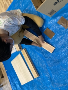 まずは、使う木材のやすりがけを行いました。どんどん削れていく様子を楽しみながら、作業を進めていました。