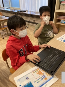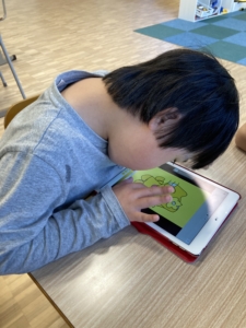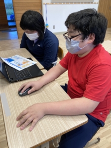プログラミング・パソコン、タブレットでお絵描き→グッズ作りのグループに分かれて活動をしています。