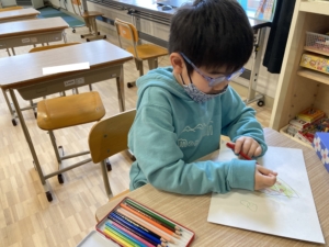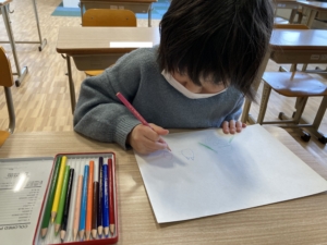 「クリスマスのたまみずきの絵にする」「ちょっとこわい感じがいい」「自分やママの絵を描く」とみんなそれぞれのテーマで、個性のある絵を描いていました。