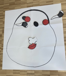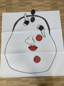 普通の福笑いとは一味違い、目や鼻などのパーツをおかめの顔の上に投げていきます。