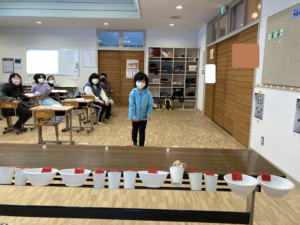 みんなで協力して5個のお手玉をカップに入れられたらたまみずきからのお年玉(お菓子)が
