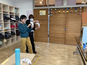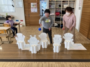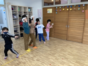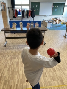 「あの的に当てます!」とボールの軌道をイメージしてから投げているお友達もいました。