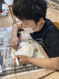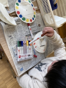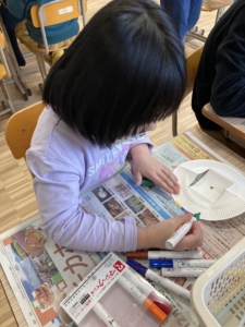紙皿を折って、先端に洗濯バサミをつけたら完成です!
