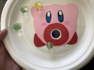 紙皿をころころ転がして、カービィの口の中(穴)にビー玉を落としていくゲームです。