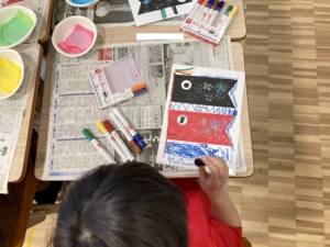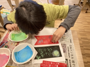 スタンピング、フロッタージュ、マーブリングなど様々な技法に触れながら、絵を描くことを楽しんでもらえたらと思います。