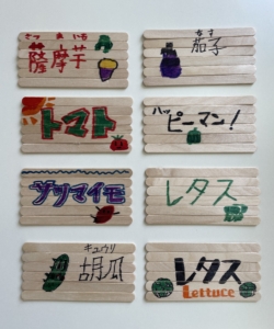 生憎の天気だったため、室内で野菜を植えたところにさす看板作りをしました!☀
