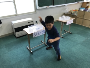 ②職員が「はこ!!」と言ったら箱を持っているお友達が立ち上がります。