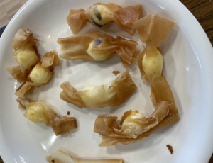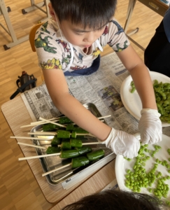 殻から実を出し、ピックにさす作業をしました。