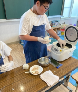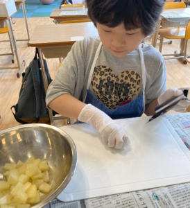 具材を切るグループと生地を焼くグループ、チーズキャンディを作るグループにわかれて作業しました。