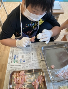 肉を串にさしたり、野菜を食べやすい大きさにカットしました。