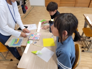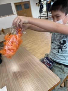 カボチャの飾り、お菓子のカゴ、折り紙の3つのグループに分かれて進めました。