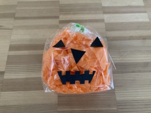 カボチャの飾りは、透明の袋にオレンジのお花紙を入れて結び、顔のパーツを貼ったら完成です!