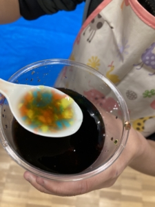 全部のフィギュアやおもちゃを救出後、カラフルなゼリーを混ぜてオリジナルドリンク作りをしました。