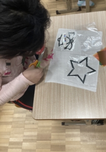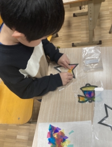 初回の今回は窓に貼ったらきれいなステンドグラス風の製作を行いました。