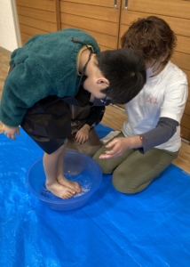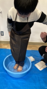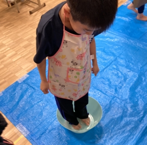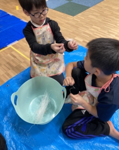 次は固い麺を足で踏み、足の裏での感触も楽しみました。
