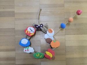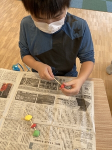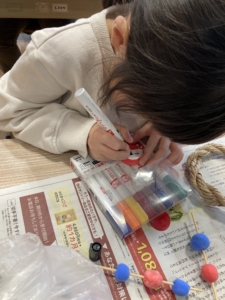 だるまやおみくじのパーツに文字や顔を描いたり、竹串に粘土をさして餅花を作ったりします。