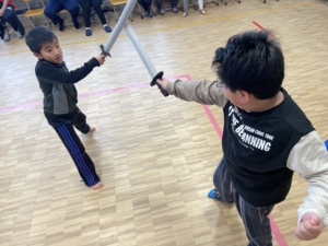 相手の肩についているボールを、刀を使って落とす「サムライ」というゲームを行いました。