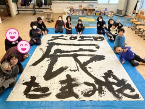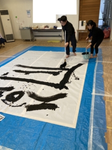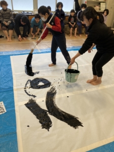 みんなの身長よりも大きい筆を使って、今年の干支「辰」