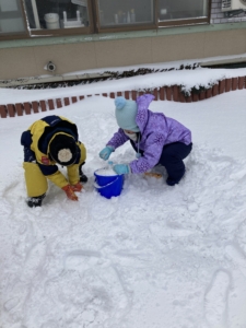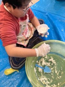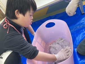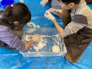 残念ながら雪遊びは中止になってしまいましたが、室内でとけない雪を作って遊びました。