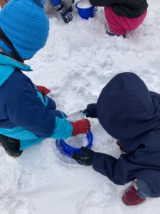 ②バケツの真ん中にペットボトルを置いて、周りに雪をつめる