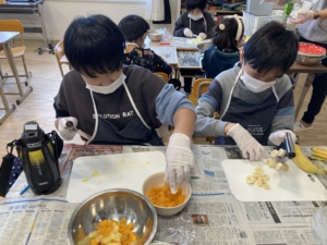 しっかりと固めないと崩れることを説明すると、みんなしっかり固めながら作ってくれました✨