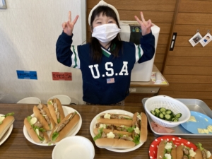 ミニハンバーグ入りのホットドッグ、ミニサンドイッチ、コンソメスープ、フルーツヨーグルト、ポテトを作りました。