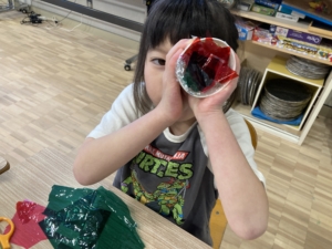 紙コップの底側に空けた穴を覗くと、きれいな景色や色が見えてきます🌈