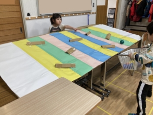 傾斜をつけた大きな段ボールの上からボールを転がし、転がってきたボールをカゴでキャッチするゲームです。