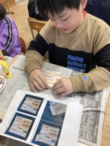 すき間ができないようにぴったりと貼らないと、台紙からずれてしまうので、丁寧に作業を進めていきます。