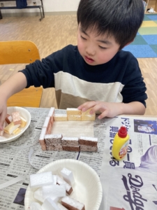 4色のブロック(発泡スチロール)を好きなように組み合わせて、4段分積み上げていきます。