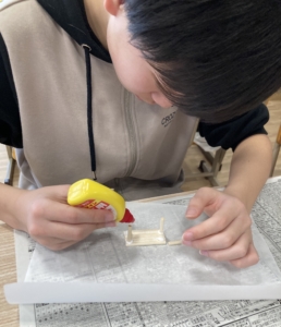 ②短い棒4本をテーブルの足としてボンドで貼り合わせます。