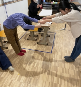 ④反対側の端のお友達までコインが渡ったら見ていたお友達で