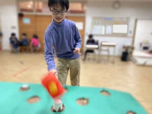 わずかに方向がずれるフリスビーを入れるのは本当に至難の業でしたが
