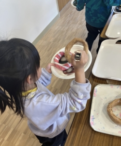 ②紙皿に貼ってあるドーナツ3つを選んで皿にのせます。