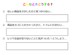 お買い物に行った先で困った場面を想定してどう行動したらいいのかを考えました。