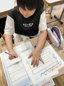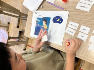 ②グループのお友達は、「イラストを見て文章を組み立てる」とそれぞれ違うテーマで活動に取り組みました。