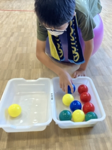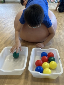 ①バランスボールにおなかをつけるようにして乗り、目の前に置いてあるカゴからカゴへボールを移す