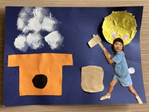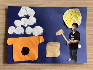 完成した作品では、子どもたちがうさぎになって、おもちをついています🐰